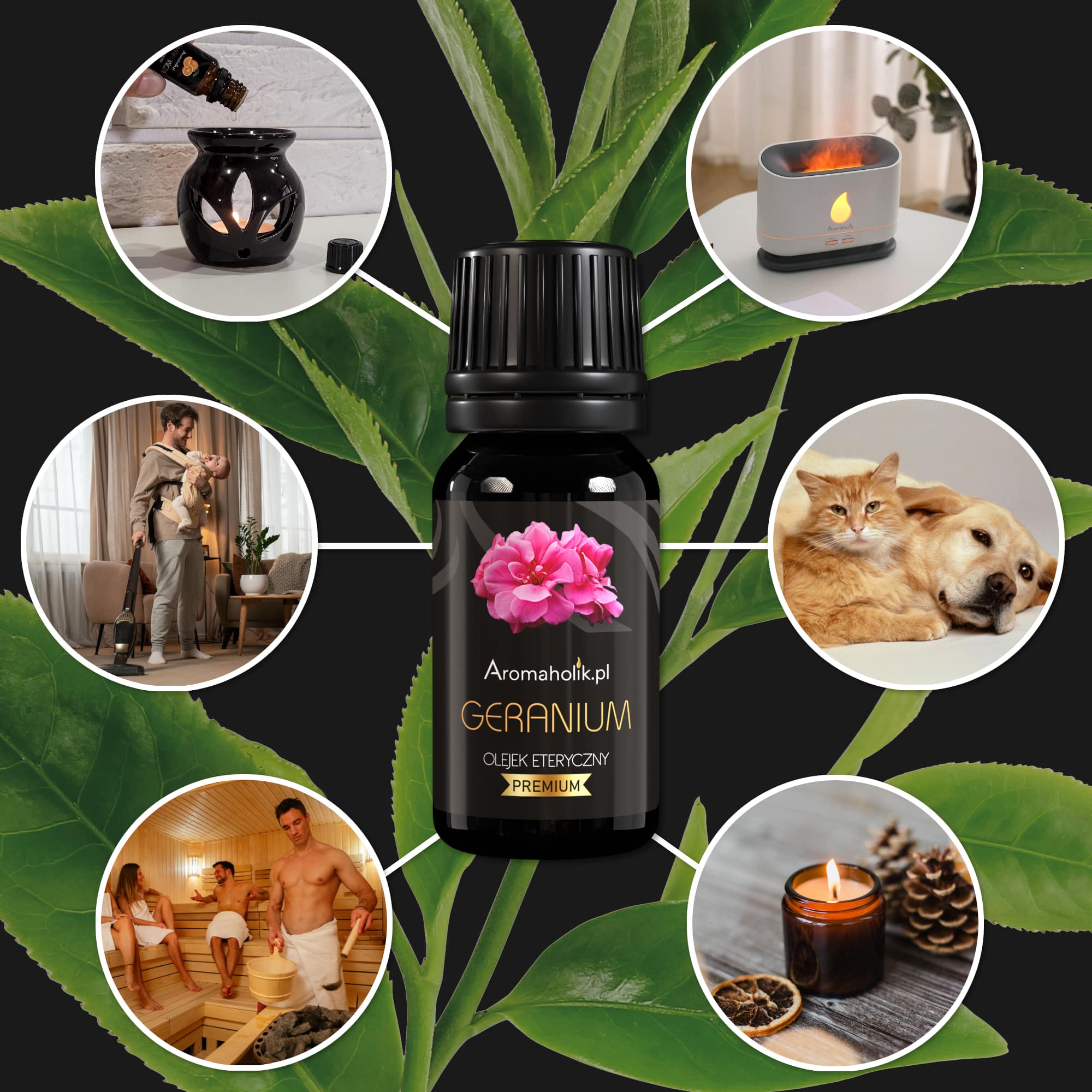 Geranium to inaczej Pelargonia Pachnąca o urokliwym i różnorodnym wyglądzie. Jej kwiaty przybierają różnorakie barwy i są nie tylko przyjemne dla oka, ale także stanowią źródło jednego z najbardziej cenionych olejków eterycznych na świecie. Liście geranium są okrągłe, głęboko wcinane i wydzielają charakterystyczny aromat, który stał się niezwykle istotnym surowcem w aromaterapii. Olejek geraniowy pozyskiwany jest poprzez destylację parową z liści oraz kwiatów i uważany jest za jeden z ważniejszych olejków eterycznych mających pozytywny wpływ na równowagę emocjonalną. Jego słodki, różany zapach działa uspokajająco na umysł i pomaga złagodzić uczucie napięcia, lęku czy stresu.
